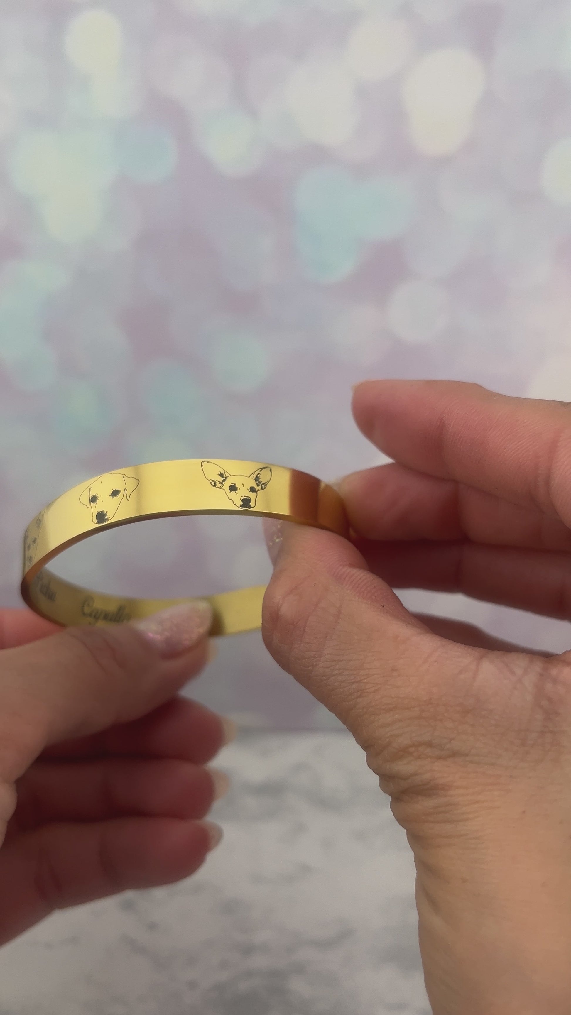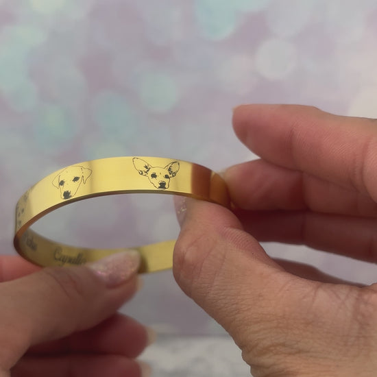 Brazalete rígido de acero inoxidable con grabado con las fotos de tus peluditos y por atrás su nombre.