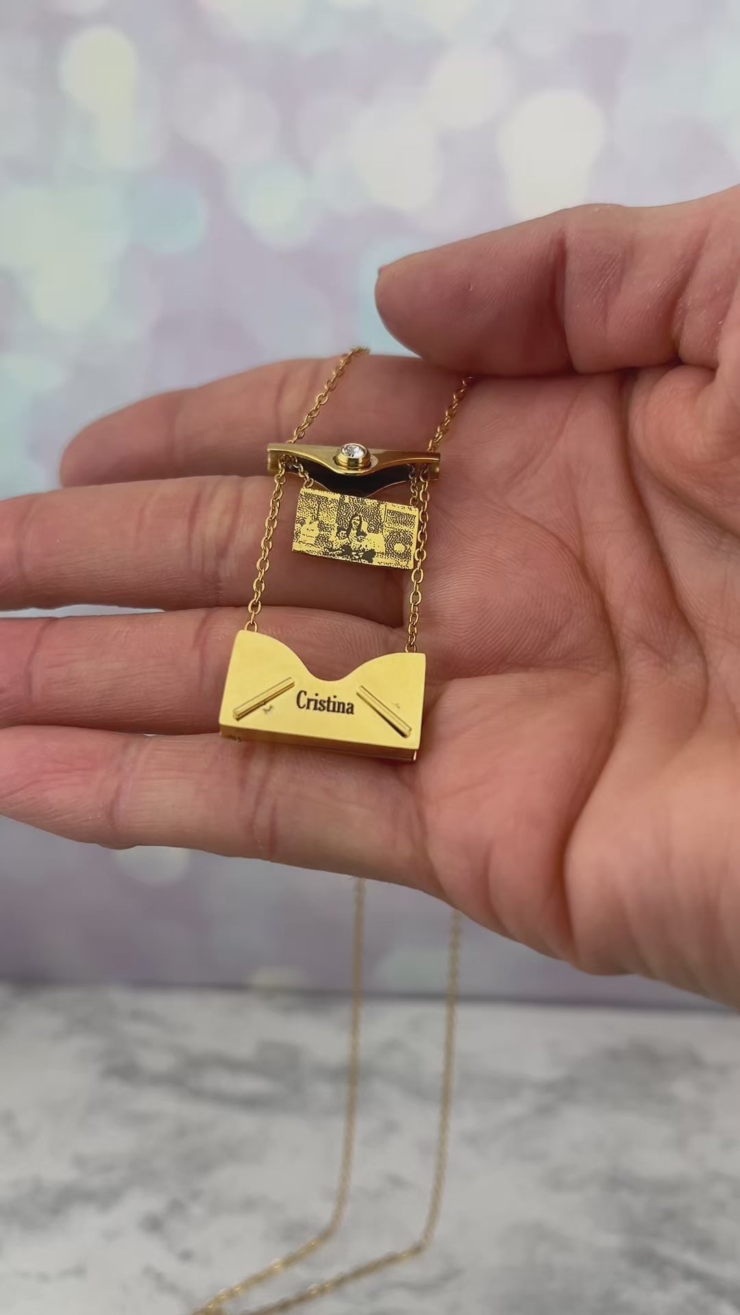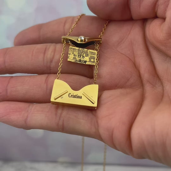 Collar de acero inoxidable con dije de sobre con carta que se abre y tiene por dentro una hoja que se puede grabar con una foto o frase y por atrás lo que quieras.