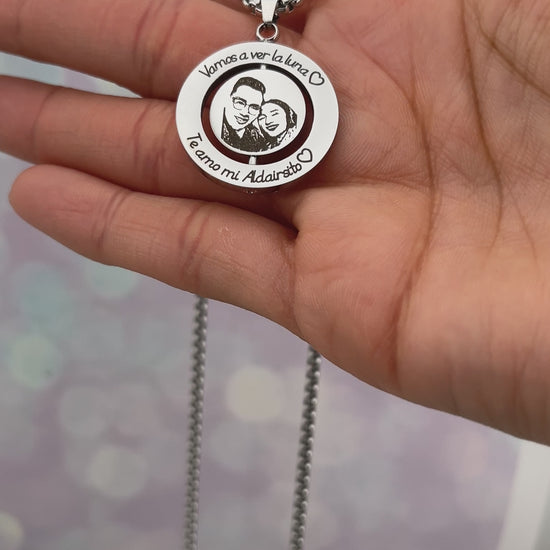 Collar de acero inoxidable con dije de redondo de ø 25 mm y disco móvil de o 20 mm que puedes personalizar por ambos lados. Con 2 fotos y lo que quieras en el aro.