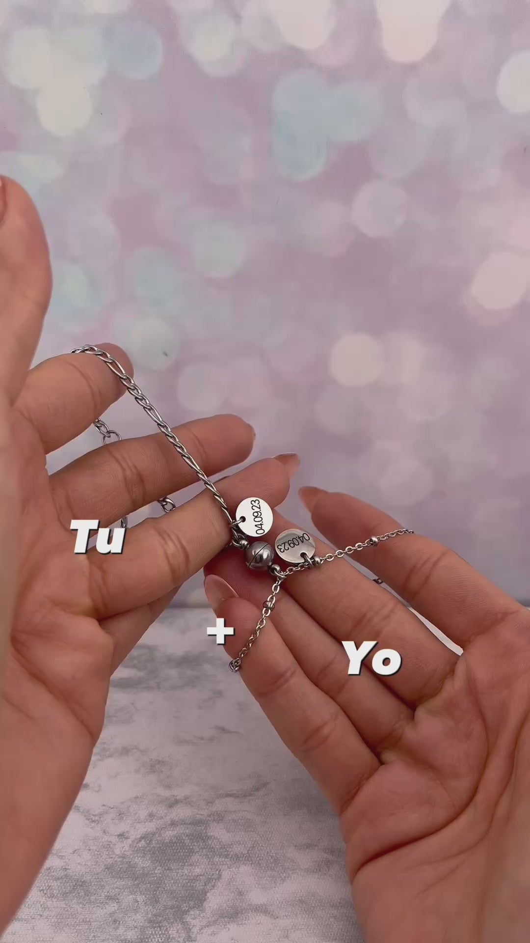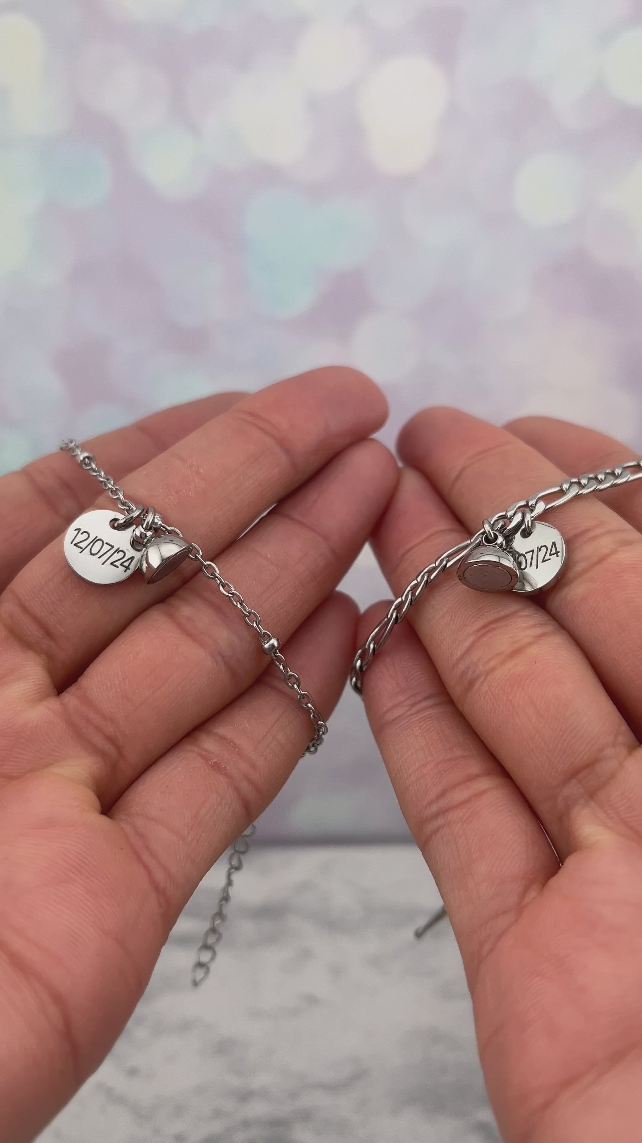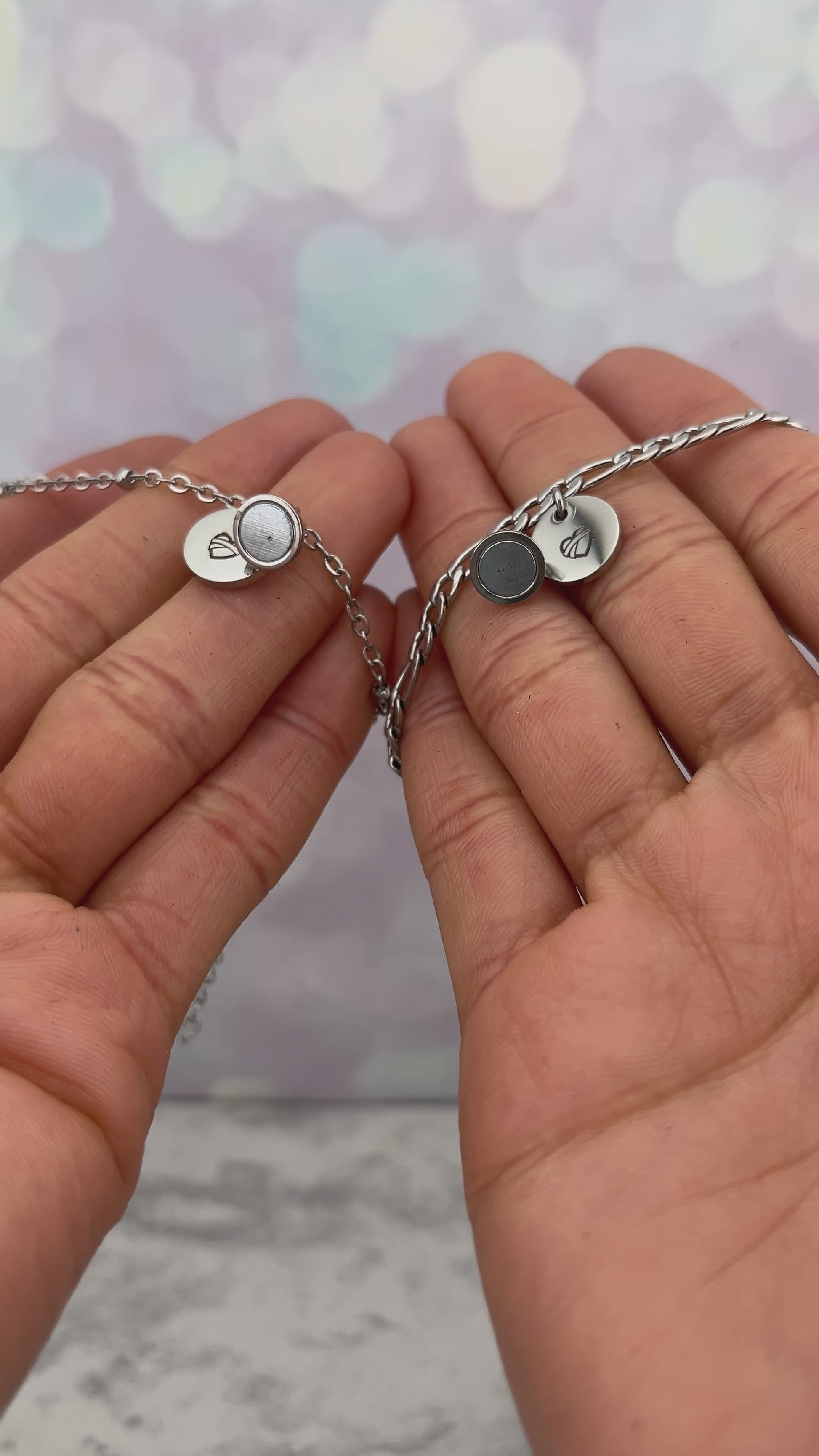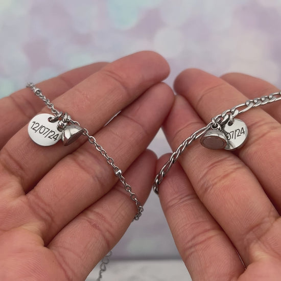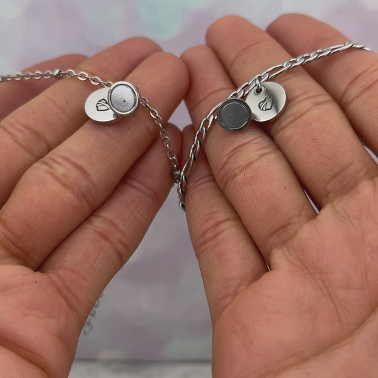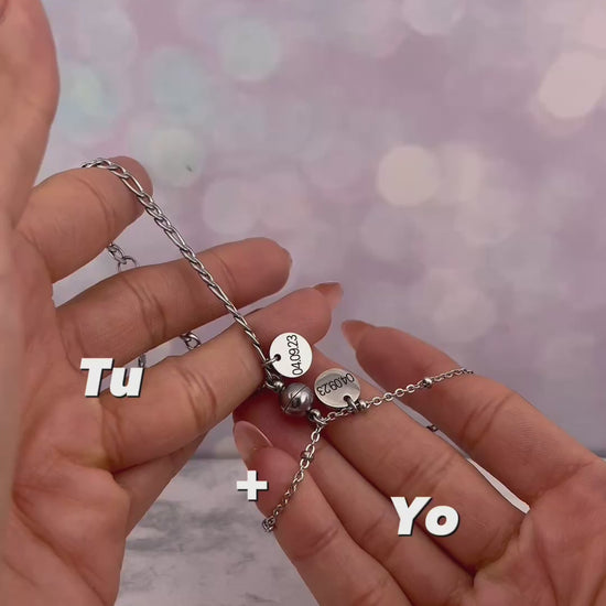 Pulseras para parejas personalizadas con dije de imán y circulo grabado de iniciales, nombres o fecha, puedes grabar lo que prefieras por atrás del dije.